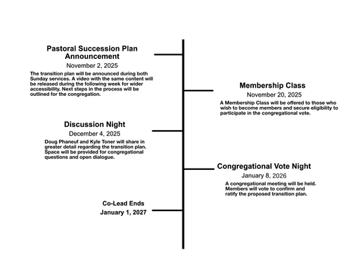 On November 2nd, our church announced a  potential  pastoral transition between Pastor Doug and Pastor Kyle. Below you will find a video explaining this transition in great detail, a written vision for this plan, a visual timeline for each of the important steps, and contact information for you to engage in conversation with the important parties in this process.